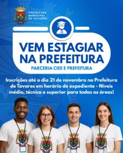 A Prefeitura de Tavares, em parceria com o CIEE, está com inscrições abertas para estágios nas mais diversas áreas.